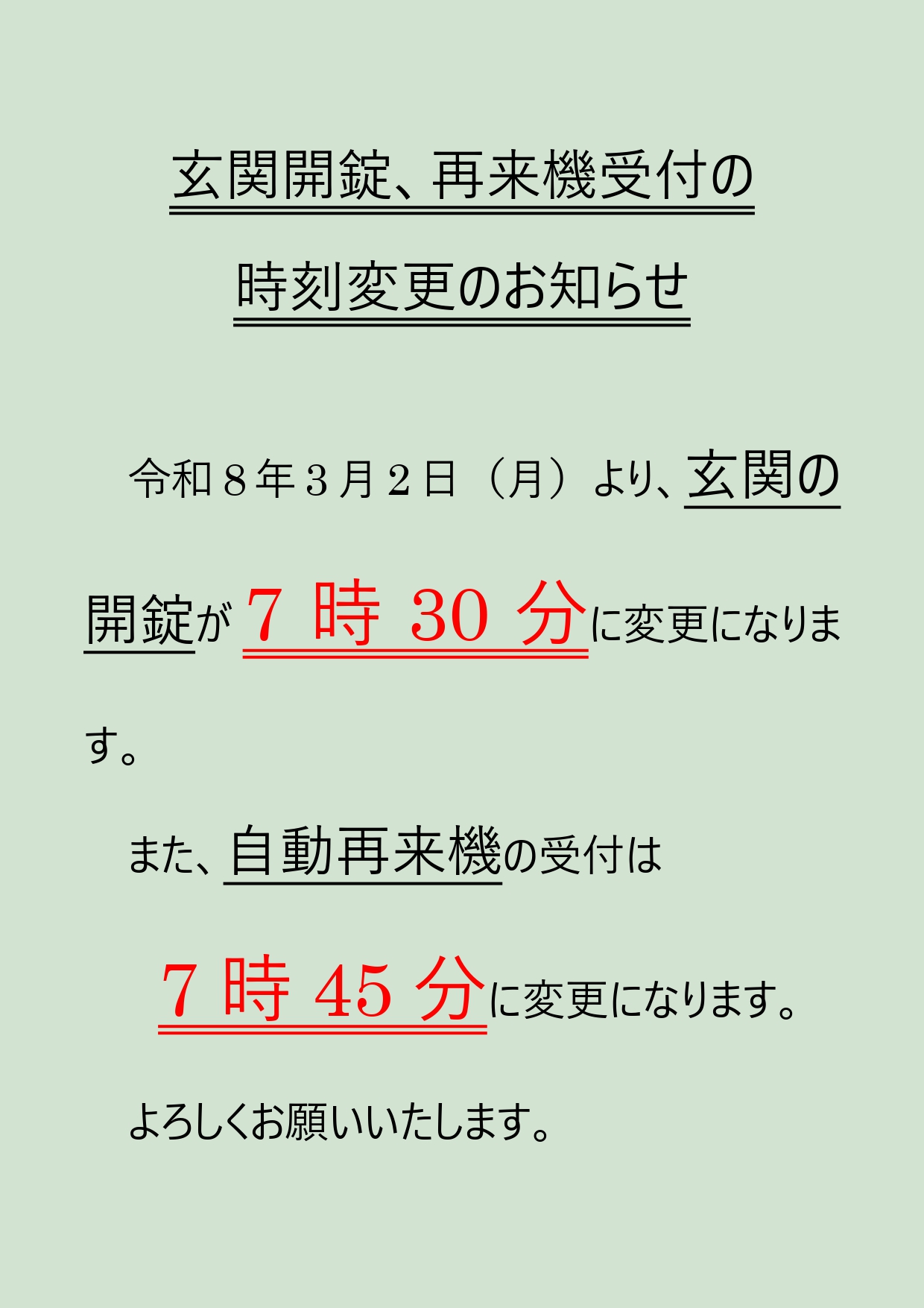 玄関開錠、再来機受付の時刻変更のお知らせ